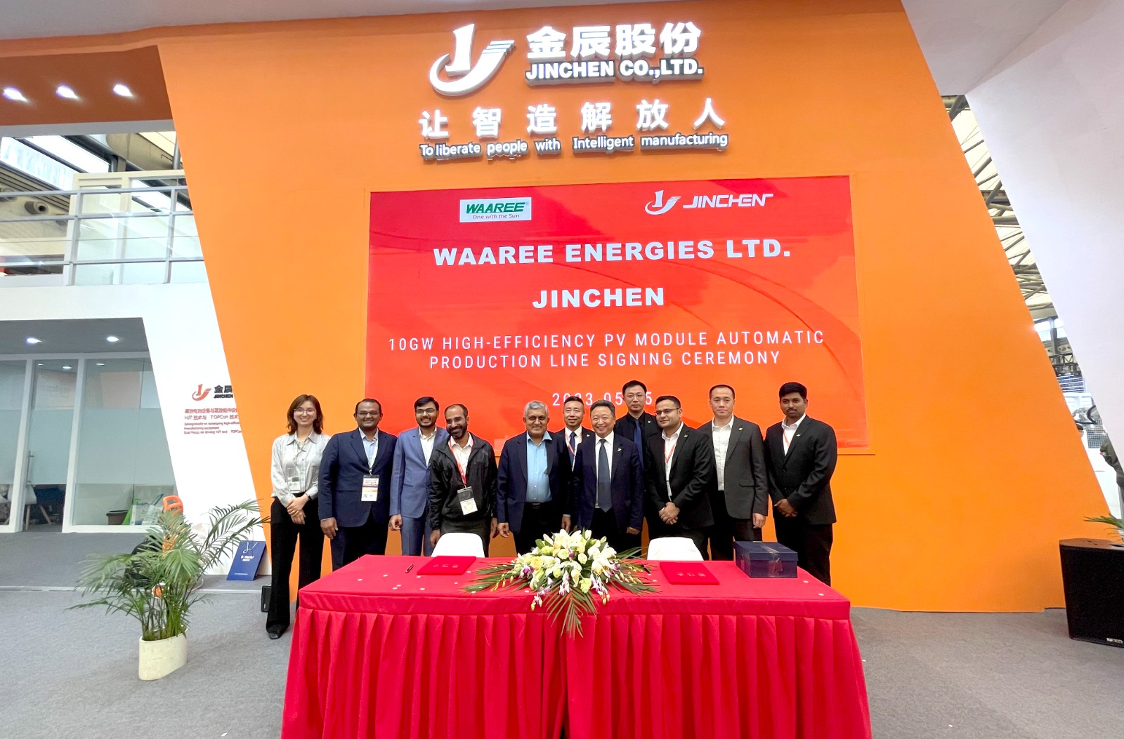 SNEC展会时代,,,,,,,,印度最大光伏组件制造商Waaree Energies Ltd.(以下简称”Waaree”)与BOBty股份正式签约10GW高效组件自动化生产线项目 。。。。。。。Waaree董事长Hitesh C Doshi先生与BOBty股份董事长李义升先生出席签约仪式 。。。。。。。